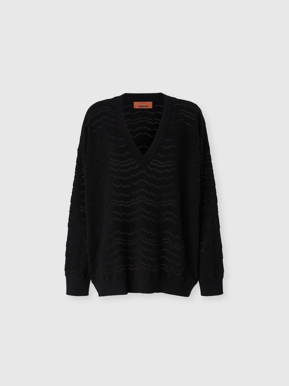 L'incedere irregolare dello zig zag tono su tono increspa la maglia di viscosa e lana del pullover con scollatura a V. I profili lisci completano il modello.