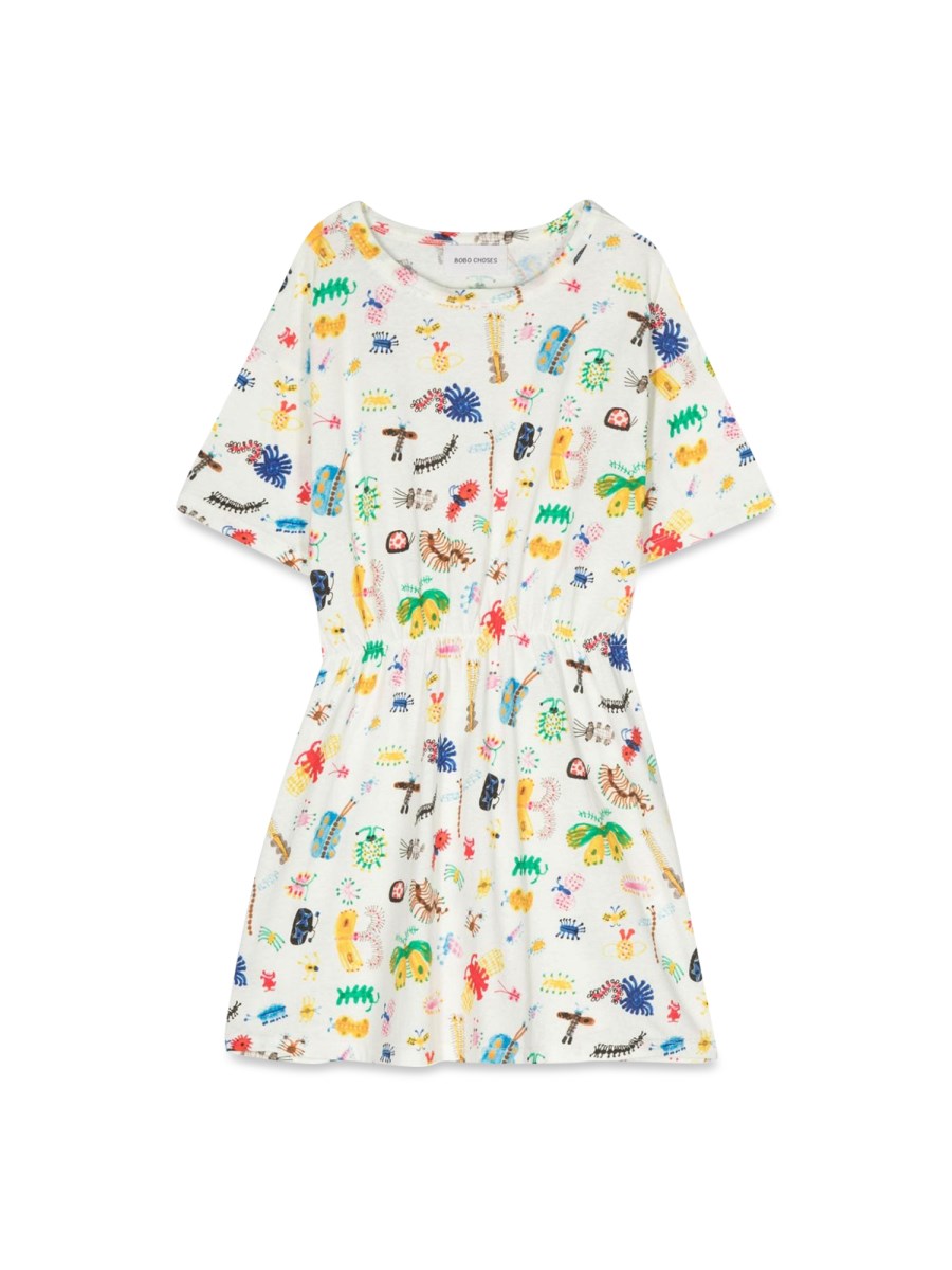 Questo affascinante abito di Bobo Choses è perfetto per la vostra piccola fashionista che ama distinguersi tra la folla. Il comodo design a girocollo assicura una vestibilità comoda che il bambino amerà indossare tutto il giorno. L'abito presenta una stampa giocosa di insetti colorati, che lo rende un'aggiunta divertente e vivace al suo guardaroba.