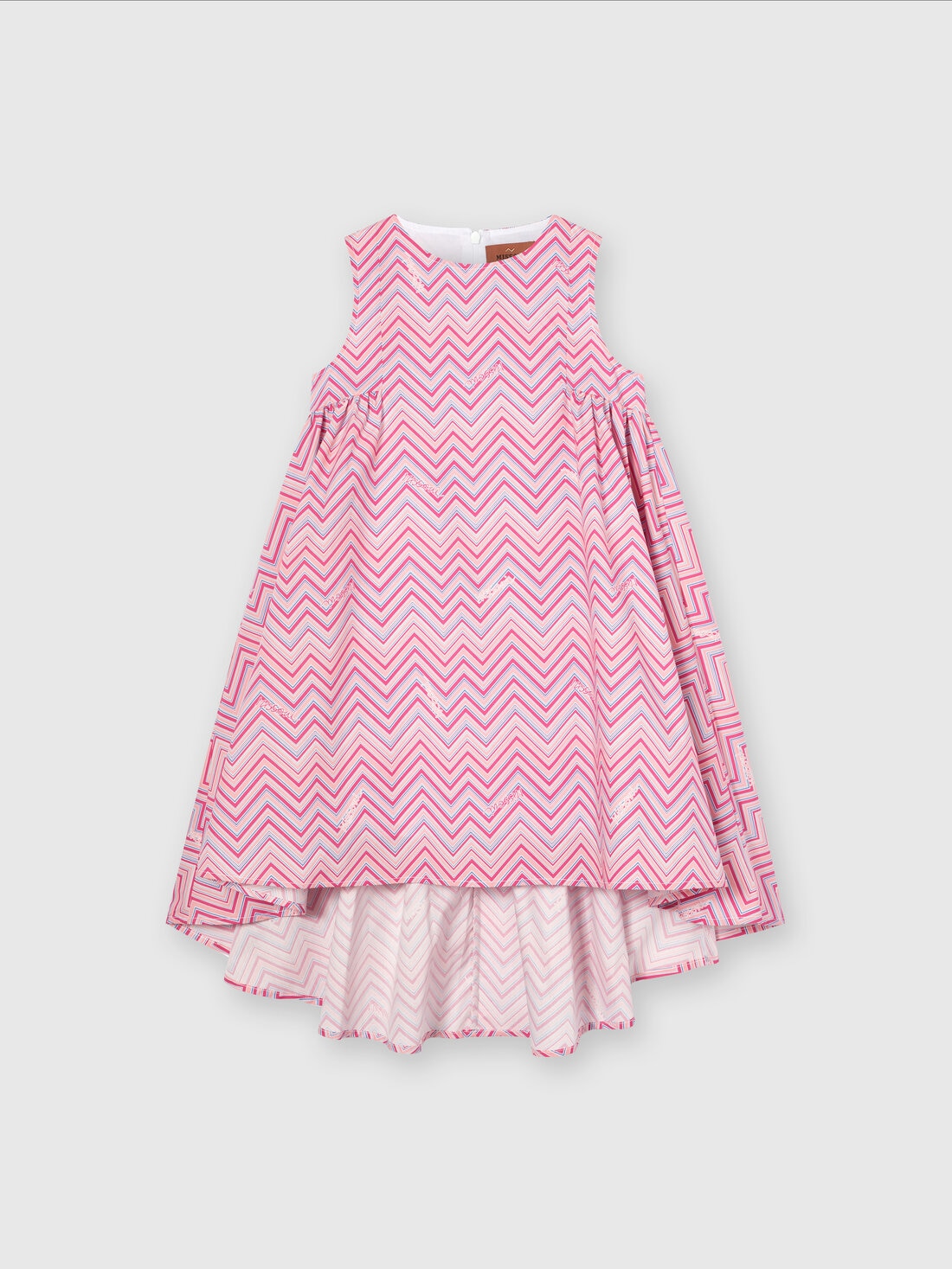 L'abito da bambina è realizzato da Missoni in popeline di cotone stampato con il fine motivo zig zag all over. Il modello senza maniche presenta una gonna svasata, più lunga nella parte posteriore, con l'aggiunta di eleganti drappeggi.