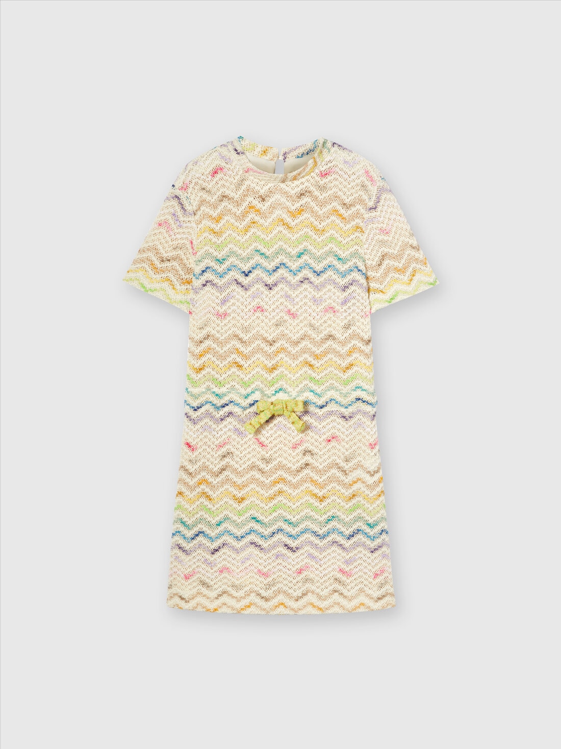 L'elegante fiocco abbinato sottolinea con raffinatezza il punto vita dell'abito da bambina Missoni. Realizzato in maglia di misto cotone, il modello a maniche corte presenta il motivo zig zag all over.